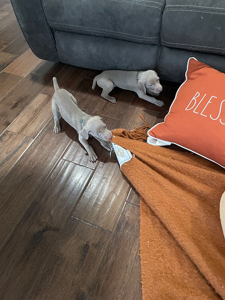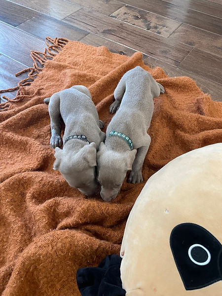 Dolly and Lucy both just had a litter. Its a pile of gorgeous weims overhere! We have males and females available. They are ready to come home mid October.